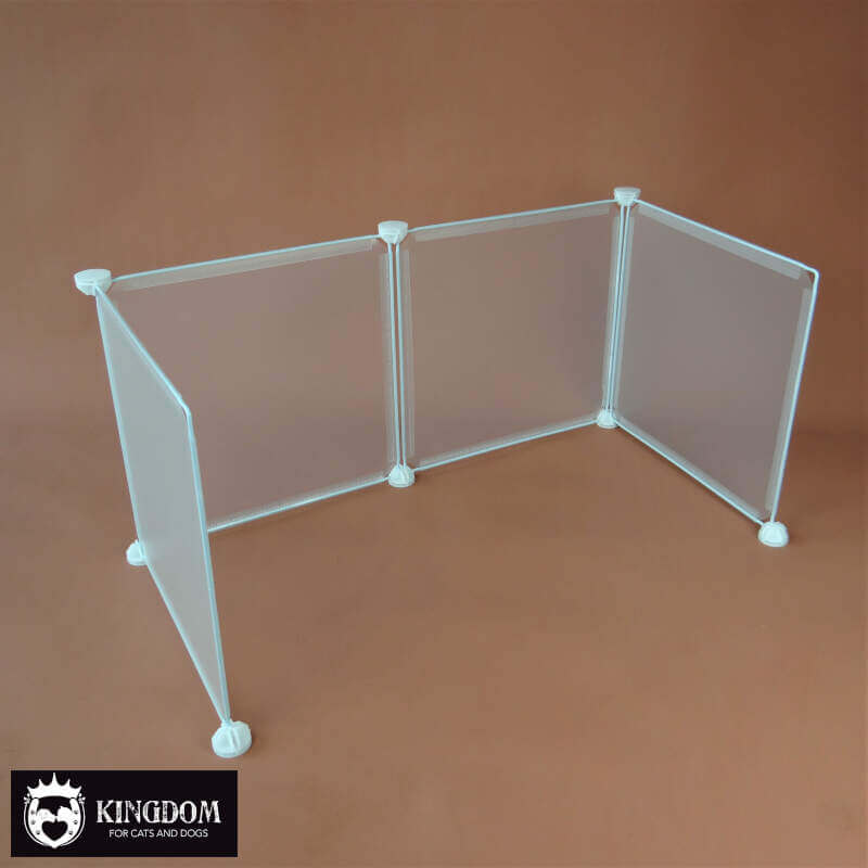 Set van 4 half-transparante kunststof panelen in een metalen frame à 35 x 35 cm. De panelen zijn op verschillende manieren in elkaar te zetten en naar wens uit te breiden. Ideaal om te gebruiken bij kittens die voor het eerst gaan rondstappen buiten het nest.