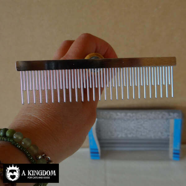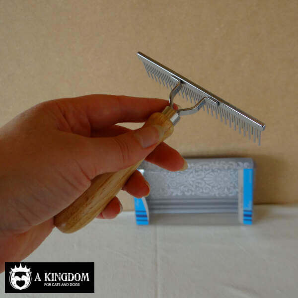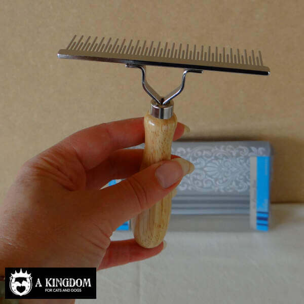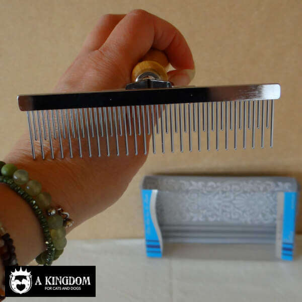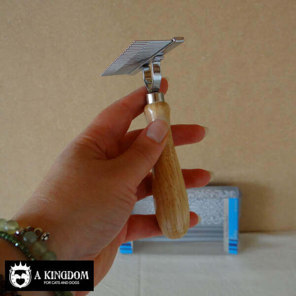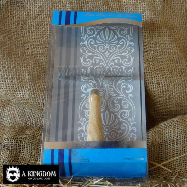 Een kort-lang getande kam, harkmodel met houten handvat. Het houten handvat geeft deze kam een goede grip tijdens de vachtverzorging van uw trouwe viervoeter.