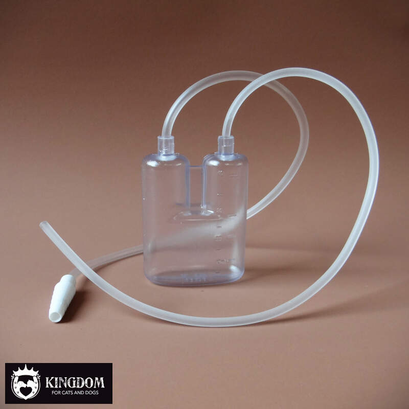 Slijmzuiger met dubbele kamer en wit mondstuk. Om slijm uit de keelholte te zuigen bij een pasgeboren kitten of pup wanneer dit de ademhaling belemmerd.